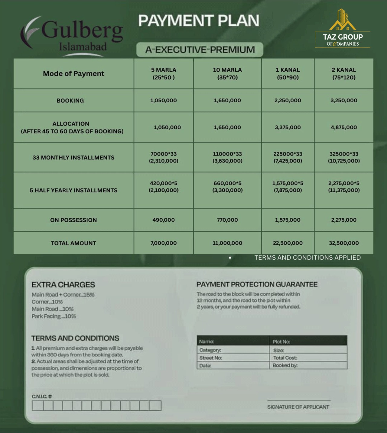 | Booking | PKR 1,050,000 | PKR 1,650,000 | PKR 2,250,000 | PKR 3,250,000 |